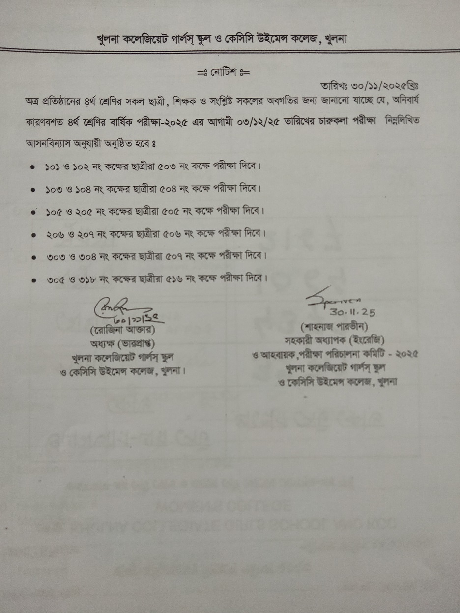 ২০২৫-২০২৬ শিক্ষাবর্ষে একাদশ শ্রেণির ছাত্রিদের নিবন্ধন তালিকায় স্বাক্ষর গ্রহণের নোটিশ